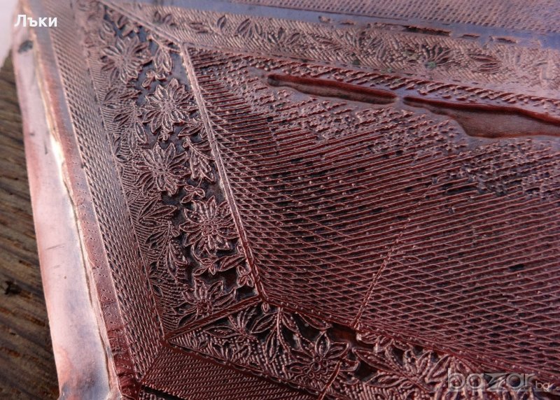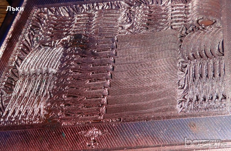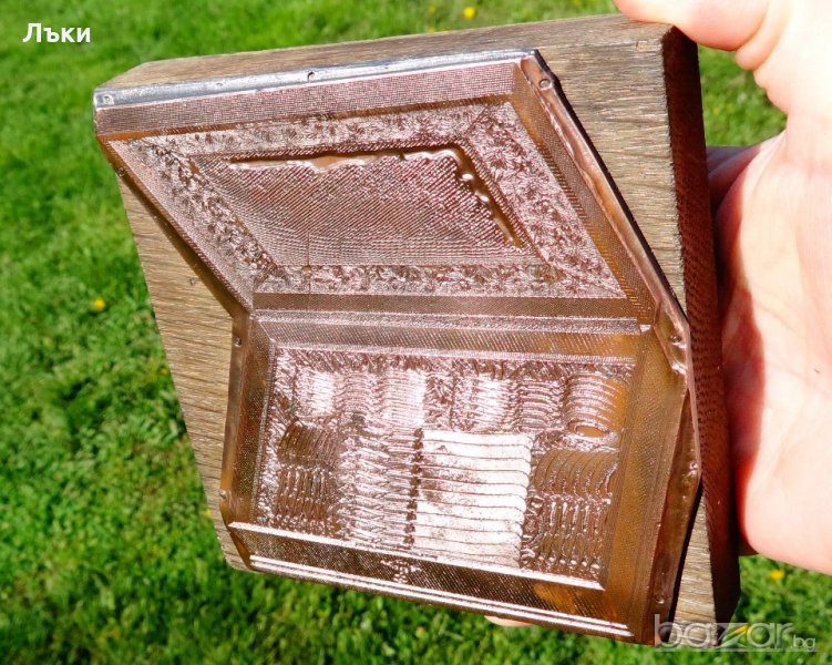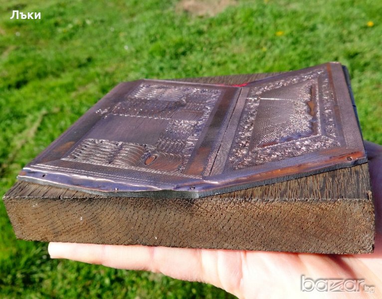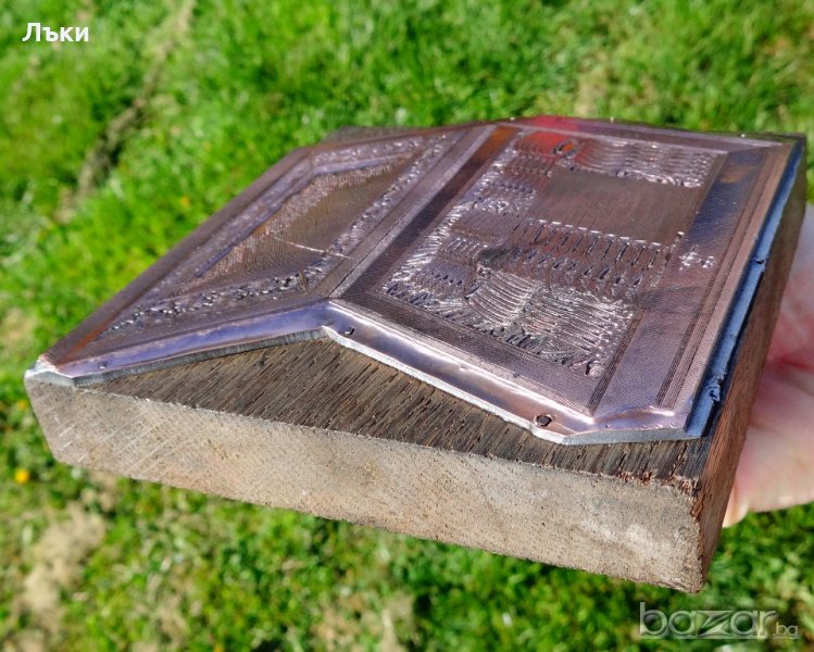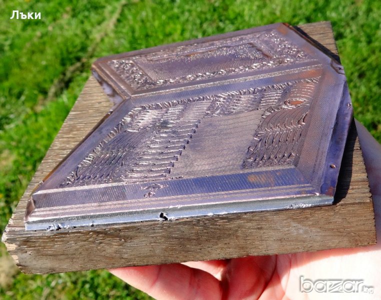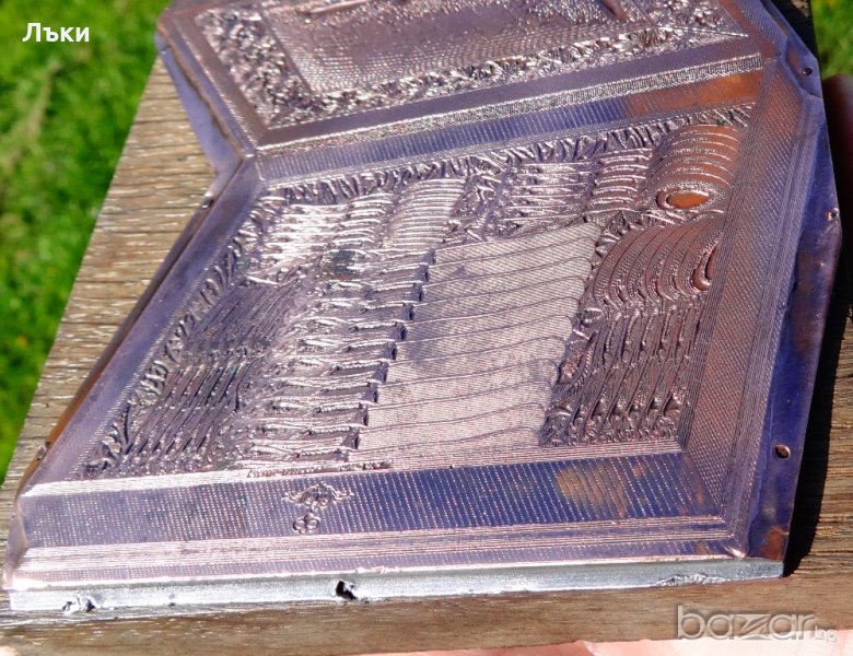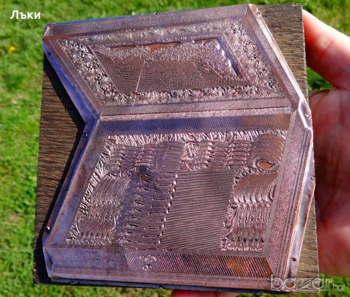Старинно клише,щампа,матрица за кожа или хартия.Представлява релефно рисуван отворен куфар с прибори.Изключителна изработка,украса и орнаментика.Състои се от медна матрица,калаена основа и много плътно