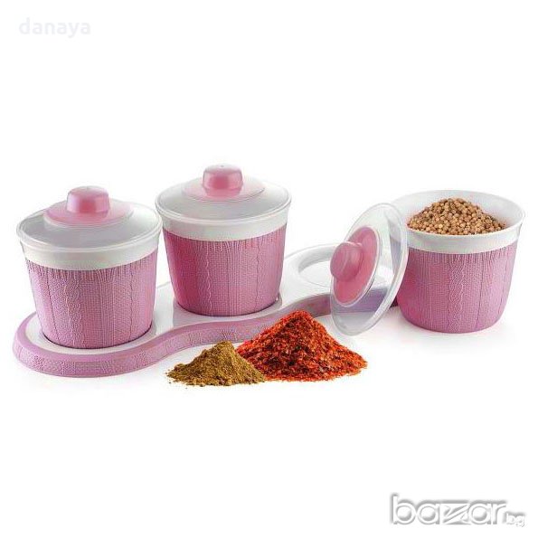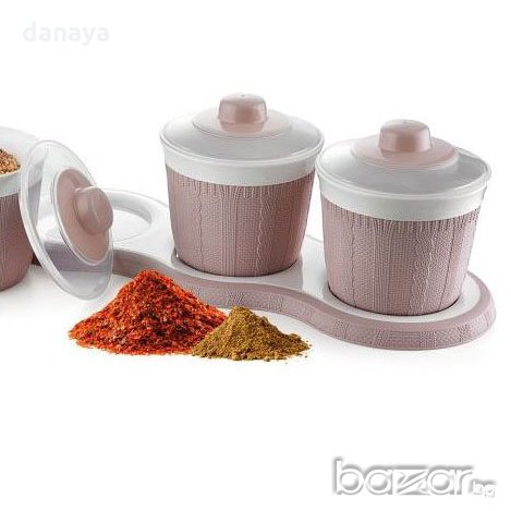 Комплект от 3 броя пластмасови буркани за съхранение на подправки, сухи храни или билки. Кутиите са стилно подредени върху красива поставка. Всеки пластмасов контейнер си има капак.