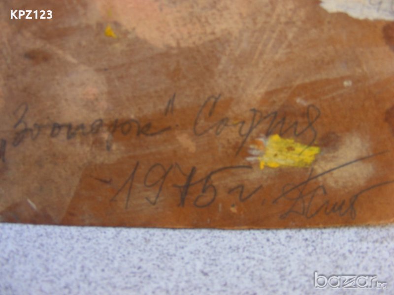 Картина пейзаж изобразяваща стария зоопарк на град София, находящ се до 1984 година в карето между бул."Евлоги и Христо Георгиеви", ул. " Й.Гурко" и бул. "Васил Левски"(бивш бул. “Толбухин”), датирана 1975 година , подпис Д.Ст на гърба на картината, вижте снимките