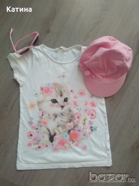 H&M блузка със сладък принт.Размер на етикета 134-140 см,9-10 год.Слънчеви очила в сладко розов цвят със същия принт.Шапка с козирка в розов цвят.Носени малко.С нормални следи от употреба.