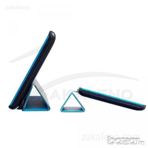 Висок клас кожени смарт калъфи с магнитно затваряне и прегъваща се предна част с функция стойка, както е показано на снимките. Външната част е изработена от качествена изкуствена кожа, а отвътре са покрити с мека подплата от велур. Кожата е приятна на допир, а същевременно достатъчно здрава и лесна за почистване. В задната си част калъфите са със здрав пластмасов гръб - идеална отливка на таблета, в който той перфектно ляга, без да се драска корпуса или да бъде под напрежение. Захващането е достатъчно здраво, няма вероятност от случайно изпадане на таблета. Пластмасата е устойчива и не се чупи или рони, както при повечето евтини калъфи. Имат всички необходими функционални отвори.
