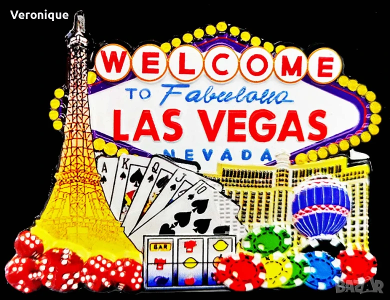41. Магнит Лас Вегас, САЩ/ хотел Беладжио с танцуващите фонтани, копията на Айфеловата кула, Статуята на свободата, Хеопсовата пирамида в казино «Луксор» 8.6 x 6.1 cm– 12 лв