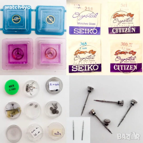 Разполагаме с богат набор от части за механични и кварцови часовници, будилници, стенни часовници: Баланси, Оси, Анкери, Ремонтоари, Коронки, Пружини, Колелета, Колела Уплътнения за заден капак, Уплътнители и др.