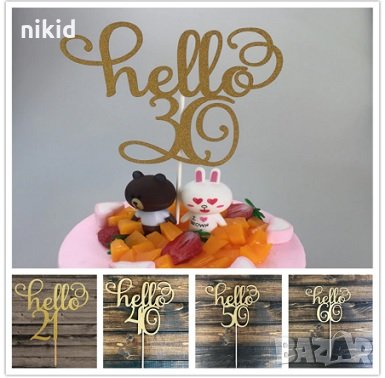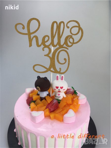 Hello 30 години Честит Рожден ден ЧРД златист брокат мек топер с клечка за торта → Обява 21513726