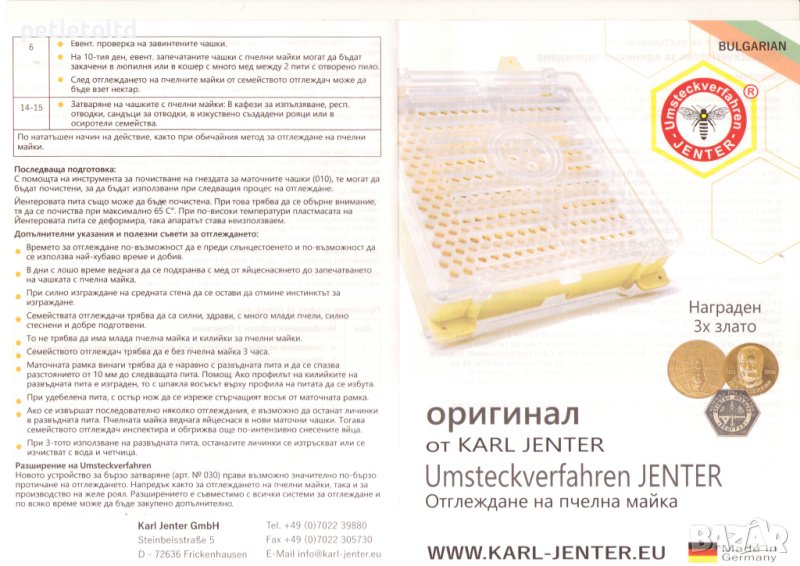 Процесът за отглеждане на кралици, наречен Йентеров апарат е награден с 3 златни медала: