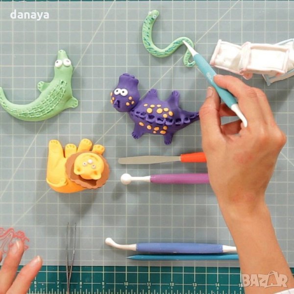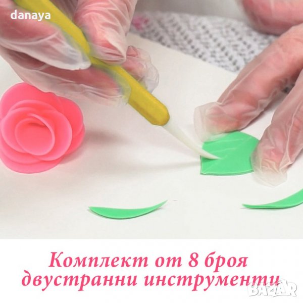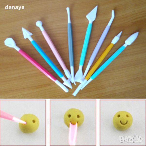 Комплект от 8 броя двустранни инструменти за моделиране на захарно тесто, шоколад, декорация на торти и сладкиши. Всеки инструмент има по два различни накрайника, което прави общо 16 накрайника за моделиране на различни фигури. Лесна изработка на цветя, човечета и всякакви други декорации.
