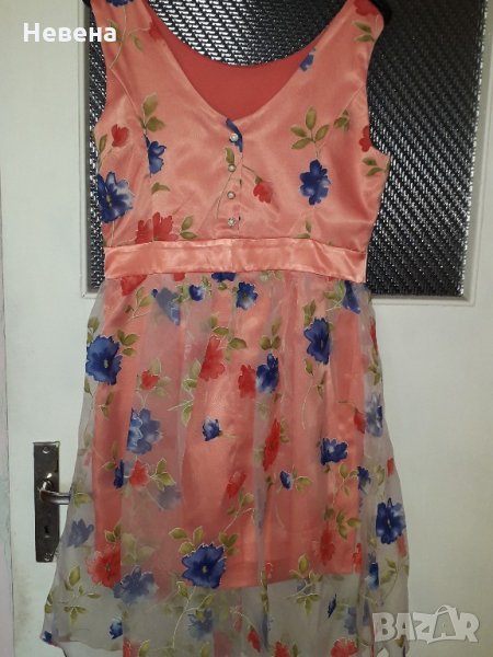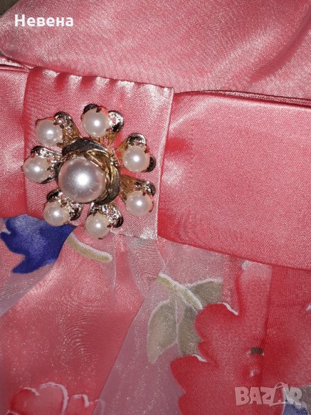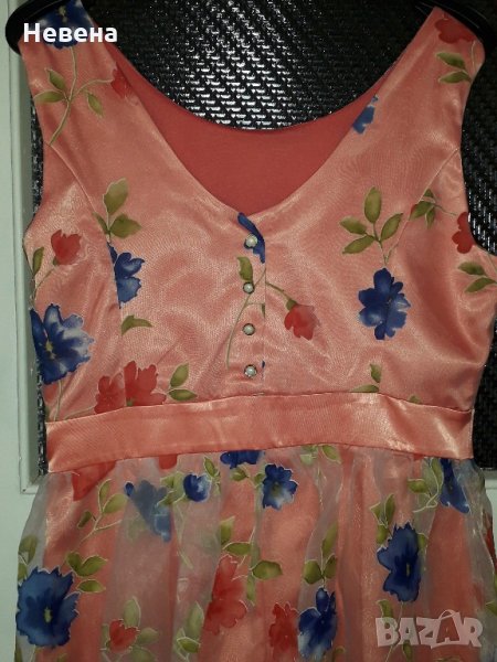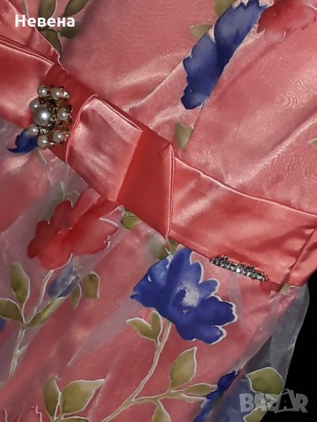 Официална рокля - бутик, чисто нова, неупотребявана с етикета. Много красив прасковенорозов цвят от сатен с прозрачна материя отгоре на цветя, с пришит колан отпред с пандела и аксесоар перли, отзад има с декоративни копчета перли, размера е около № 44-46. Размерите на роклята са: Талия - 42 см отпред или 84 см обиколка, гръб отзад от подмишница до подмишница - 50 см, отпред на гърдите - 52 см, дължината от горе на рамото до долу ръбчето на прозрачната материя е около 104 см.