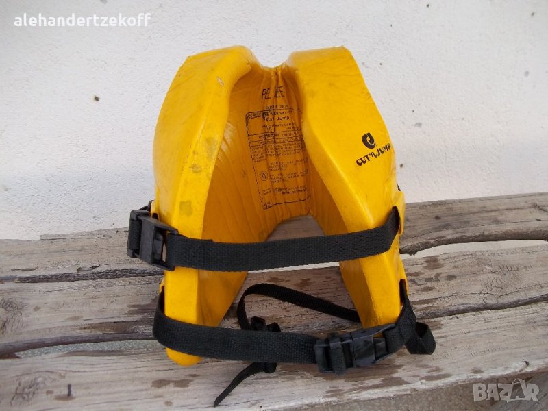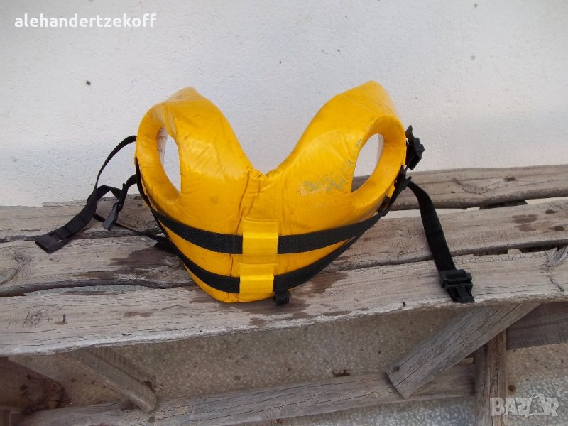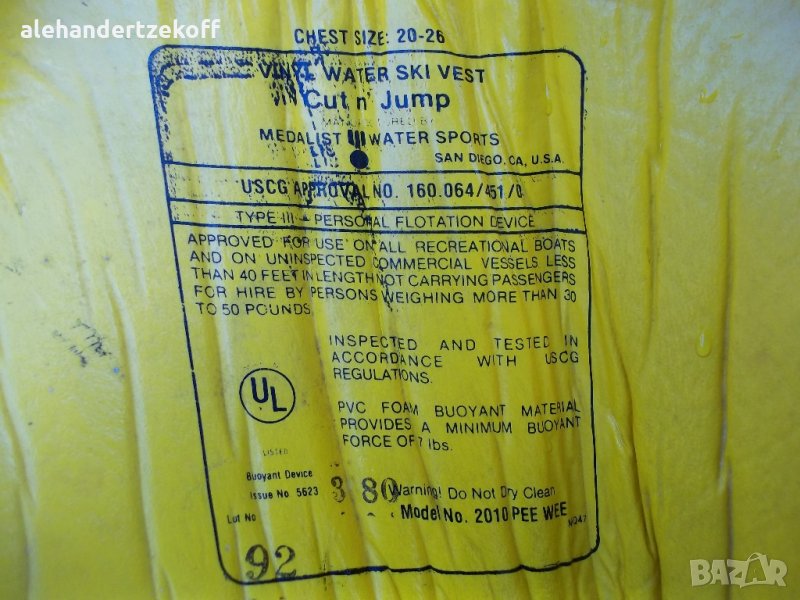 Жилетката е в отлично състояние с нормални следи от употреба, производство на водеща фирма от San Diego, CA, U.S.A. трикратен медалист в областта ,,Защитни средства при водни спортове'' .Задължителен атрибут при практикуване на водни ски , скокове във вода , както и при всички плавателни съдове развлекателни или не , под или без инспекция. Жилетката е инспектирана и тествана в съответствие с USCG нормите! Изработена е от PVC /запомнящ/ материал с минимална плаваща сила от 7 фунта.Размерът и е 20-26см в диаметър. Изключително надеждно захващане с два колана през гръдния кош и един през четала.Модела е уникален , както и бройката .т.е една! Цената може да се коментира.
