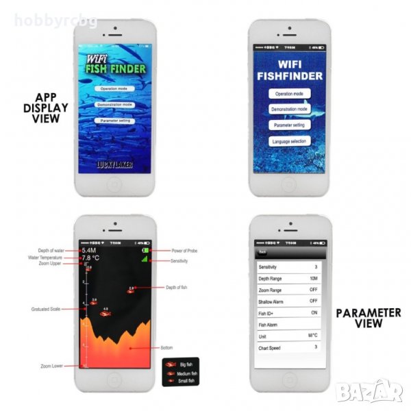 безжичен сонар може да се използва в океана, реката или езерото и е фантастичен уред за откриване на риби във всяка прясна или солена вода. WiFi обхвата на сонара е до 70 метра и може да се свърже с максимум 5 устройства. Сонарът разполага с богат избор от меню на 12 (дванадесет) различни езика: руски, немски, холандски, испански, френски, японски, корейски , унгарски, португалски, полски, английски, китайски.