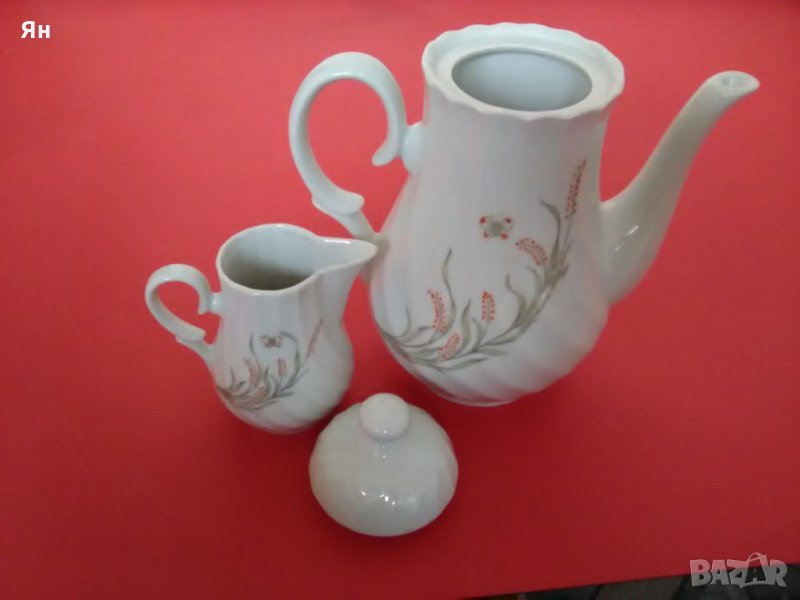 Красив Стар Ретро Сервиз от Качествен Български Порцелан-Чайник с капаче и Каничка за Мляко/Сметана