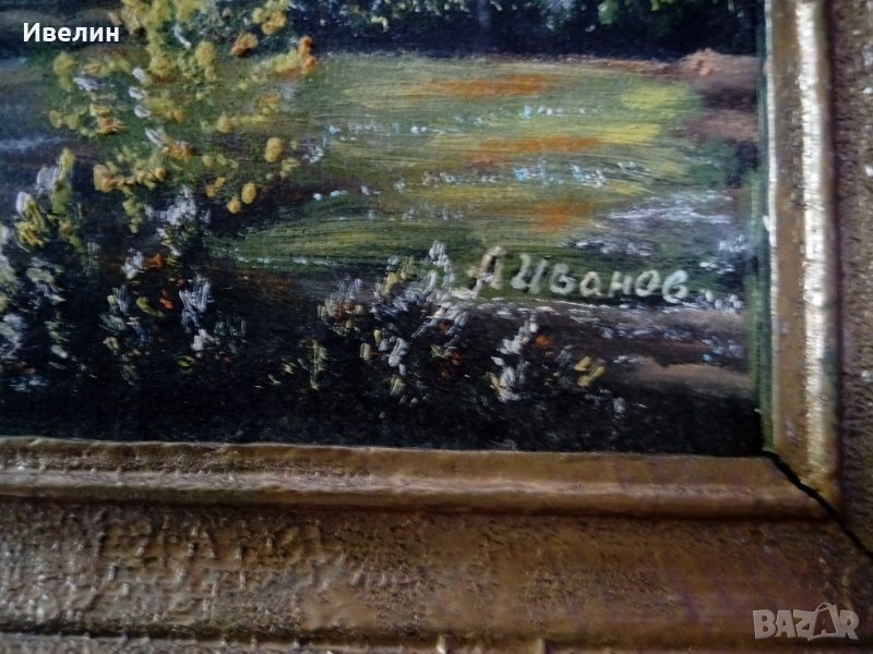 картина-пейзаж на иванов.масло на шперплат,подписан с дървена рамка с размери 46см/65см,вътрешни 38см/57см.