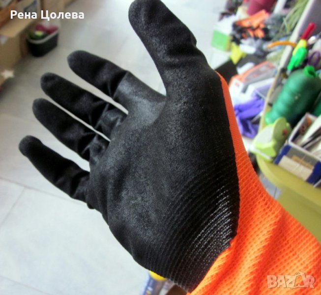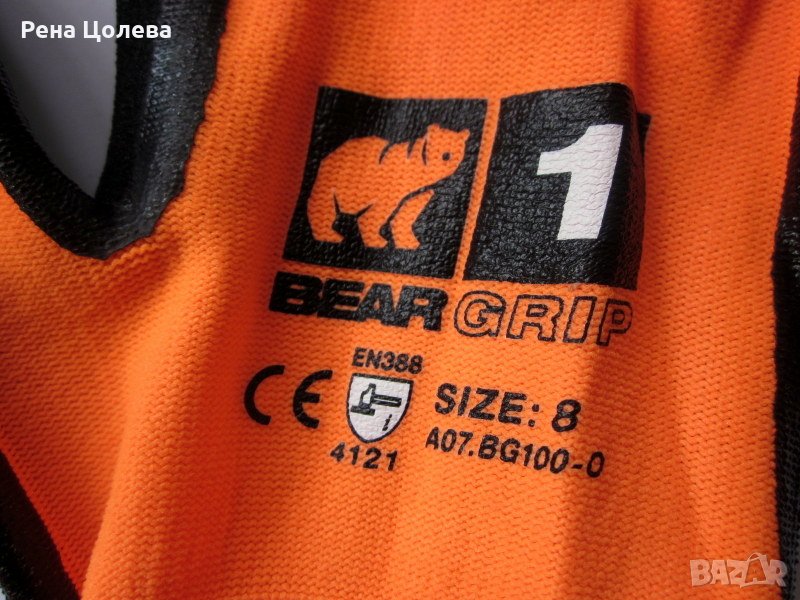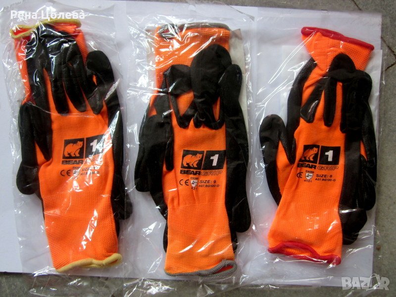 Работни, ръкавици с марка „BEAR GRIP" с плътност 1, със специално покритие от азотни форми с линейна плътност за дишане на ръката. Вътрешната страна към дланта е оребрена,което осигурява по-голяма плътност на захващането на предмети.