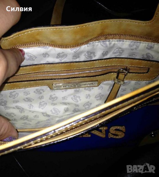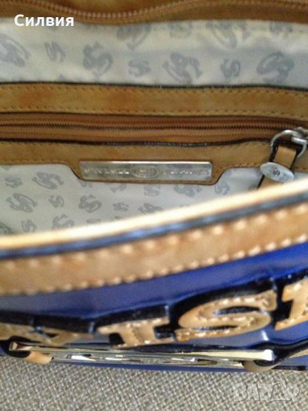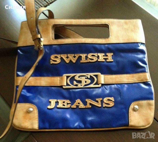 Оригинална дамска чанта, Суис Джинс, кожа. Светло кафяво и синьо, има отделно дълга дръжка, може да се носи по два начина. Не е носена никога, чисто нова е,отвътре има джоб с цип с метално лого на марката.
