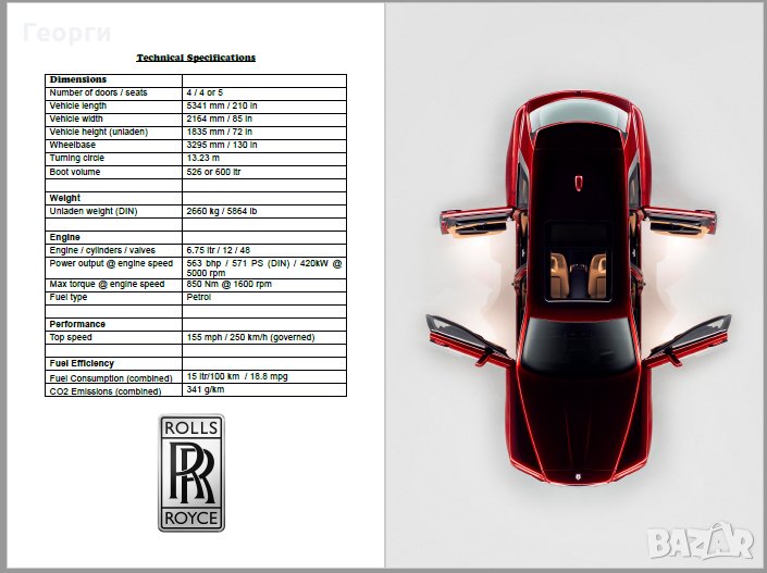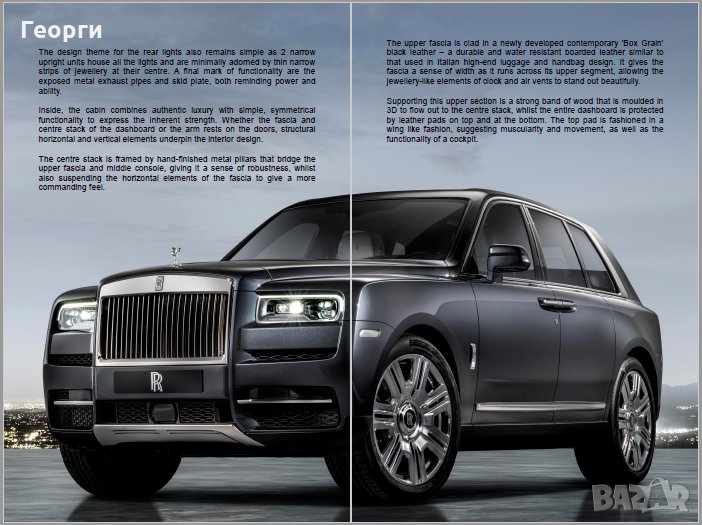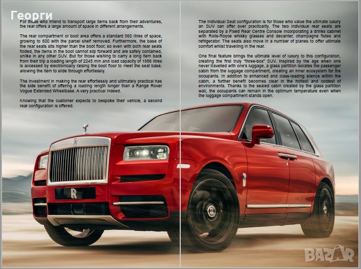 Продава се колекционерски прес кит, книжка, списание или брошура за новия Rolls-Royce Cullinan. Формат 16 х 24 см. с цялата информация на английски език и цветни снимки за модела. Брошурата е дело на българското издателство DIMS, което публикува англоезична литература за автомобилните фенове по света. Хартията е гланцирана, страниците са 32.