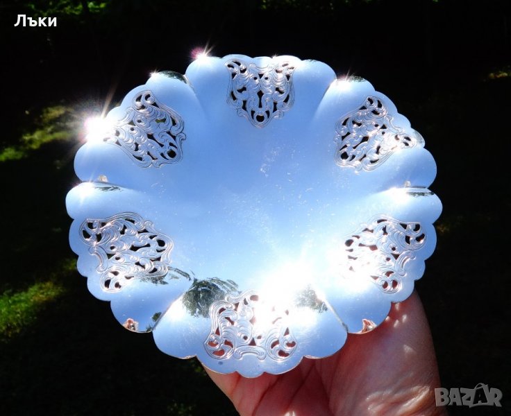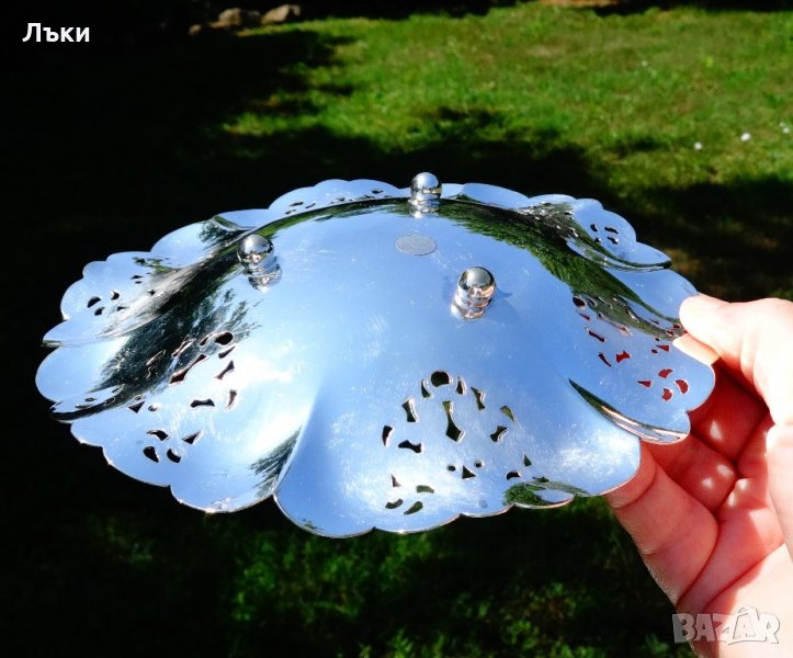 висока проба сребро.Маркирана.Има три стабилни крачета,форма на цвете и много красив ажур по края.Диаметър 18 см.,височина 3 см.,тегло 150 гр.