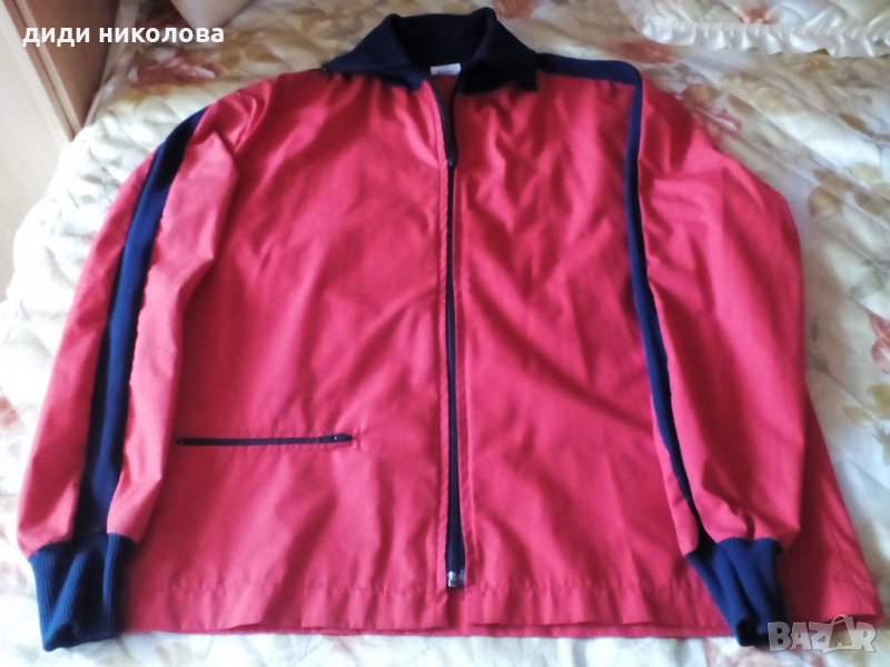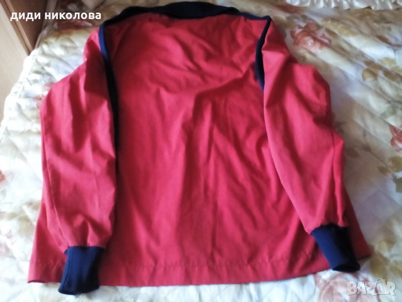 Пролетно-лятно яке в червен цвят,със сини кантове по ръкавите и синя яка . Р/р52. Материя:67%полиестер и 33%котон. Дълж.-71см. Шир.рамене-54см. Якето е унисекс-подходящо е както за мъже , така и за дами .