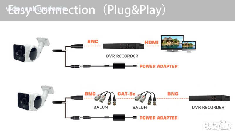 4 Мегапикселова охранителна видео камера от 5-то поколение с InfraRed подсветка от 3 H.LED ARRAY лампи от 5-то поколение (Тайванска военна технология), осигуряващи кристална картина и голямо работно разстояние през нощта. AHD (Analog High Definition - най-високо качество) е нова технология с усъвършенствана CVBS (COMET*) & HD Видео трансмисия, позволяваща пренос на видеосигнал с 4 мегапикселова резолюция 2560*1440 по коаксиален кабел на разстояние до 700 метра (RG6). Този вид системи не изискват изграждането и конфигурирането на мрежа, използват традиционната схема на свързване с коаксиален кабел и BNC конектори между камерата и видеорекордера, което прави възможно използването на съществуващи коаксиални трасета. Поради липса на компресиране на сигнала в камерата, технологията позволява наблюдение с мегапикселова резолюция, без закъснение/накъсване и без сложно конфигуриране. Липсата на допълнителни мрежови устройства - сървъри и софтуер, прави AHD системата оптималното решение за мегапикселово видеонаблюдение – икономично, лесно за инсталация, надеждно и опростено.