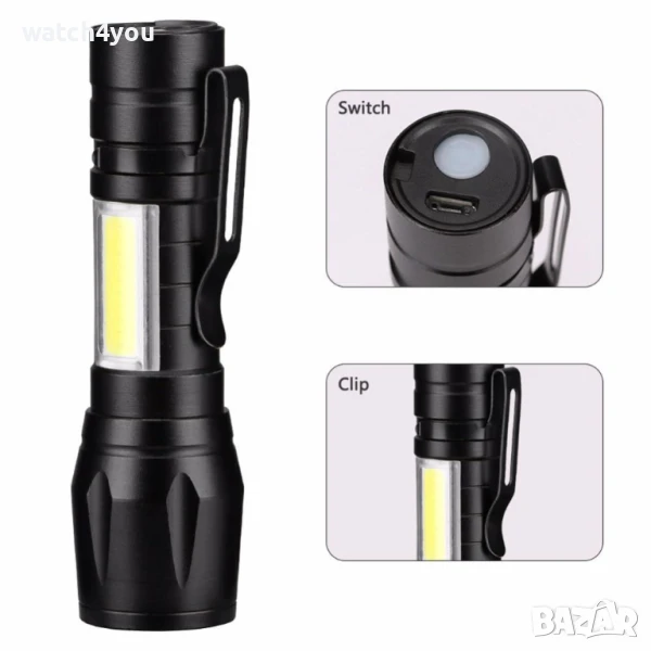 Алуминиев LED COB фенер с ZOOM, акумулаторна батерия и зареждане чрез USB кабел. Изключително силен със здрав корпус с финкции SOS и ЗООМ (ZOOM).