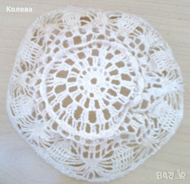 Плетена на една кука кашпа, цвят екрю. Подходяща за по-широка и плитка саксия. Със заоблено дъно – като купа. Има две бледо кафеникави петна от двете страни срещуположно, които едва се забелязват.