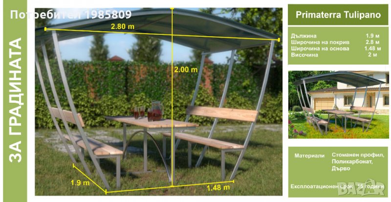 Беседка Primaterra Tulipano: 699 лв./357,39 eur. (Цветове на покрива: жълт, зелен, млечен, прозрачен, син, тониран, червен, бронз)