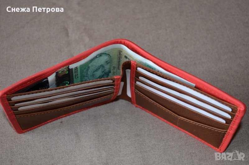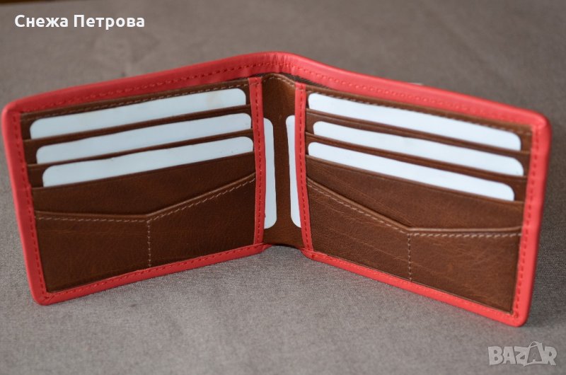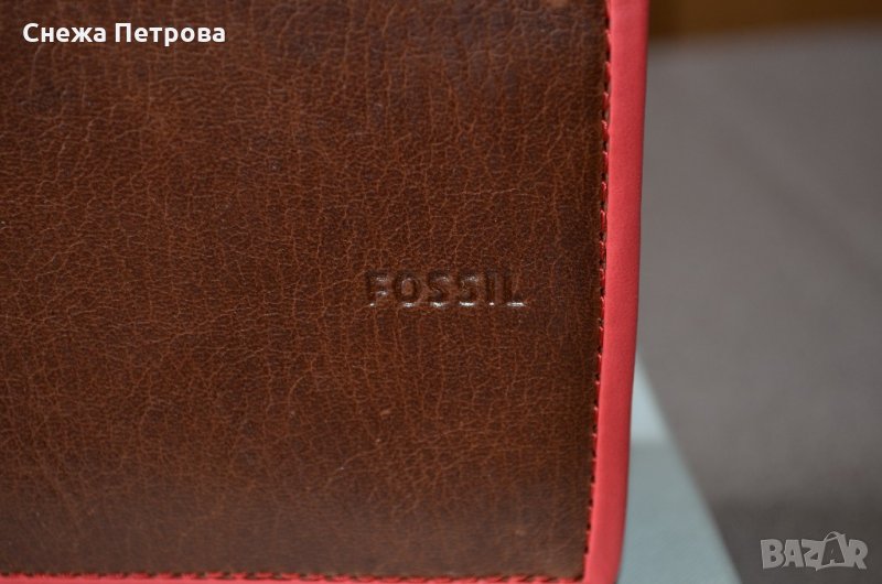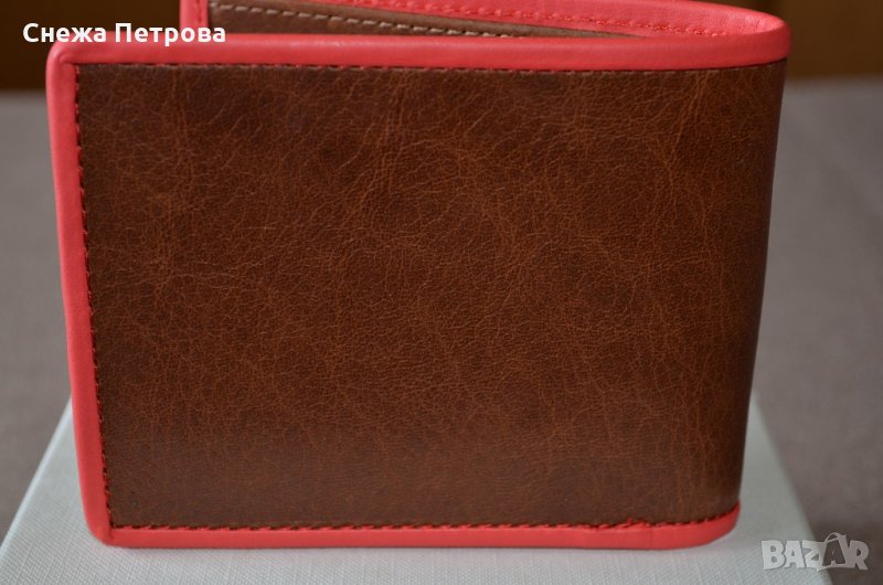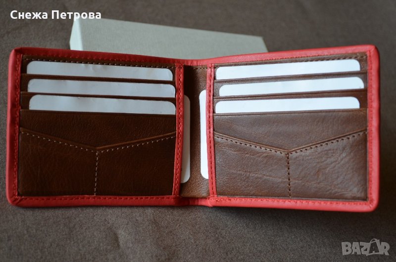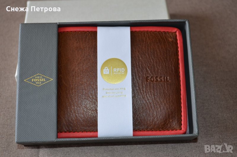 Чисто нов оригинален портфейл на американската фирма Fossil, в оригиналната си кутия и с етикета. Моделът е Harris Bifold Red. Хоризонтален тип. Портфейлът има RFID защита, тоест предпазва от кражба на данни от вашите безконтактни карти. Изработен е от естествена кожа в тъмнокафяво с яркочервен кант отстрани. Надпис на фирмата отпред на портфейла. Портфейлът има общо: