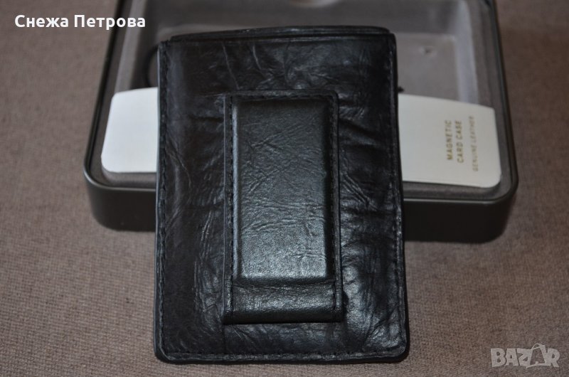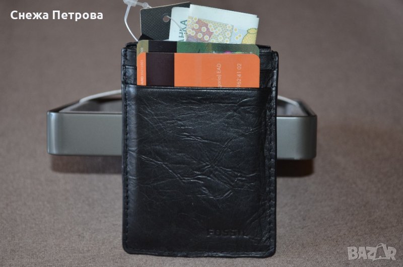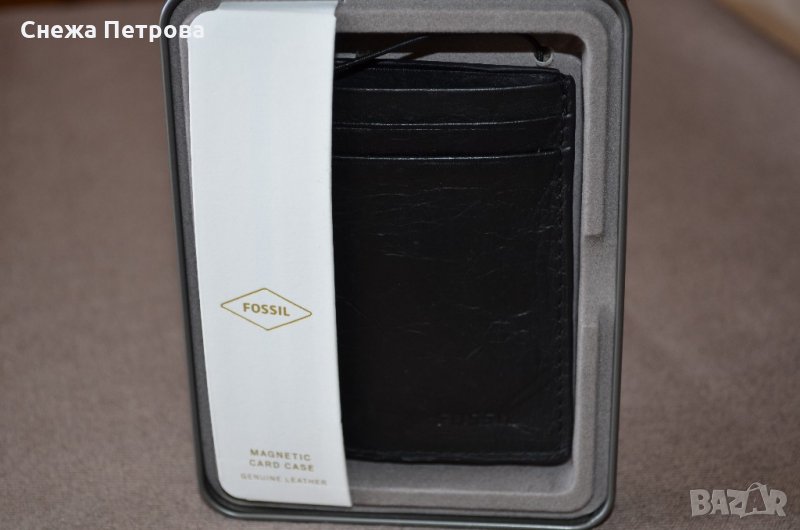 Чисто нов оригинален картодържател на американската фирма Fossil, в оригиналната си луксозна метална кутия и с етикета. Моделът е Neel Magnetic Card Case Black. Изработен е от естествена кожа в черен цвят и допълнително покрити с черно ръбове, магнит на гърба за закопчаване на банкноти. Надпис на фирмата на лицето.