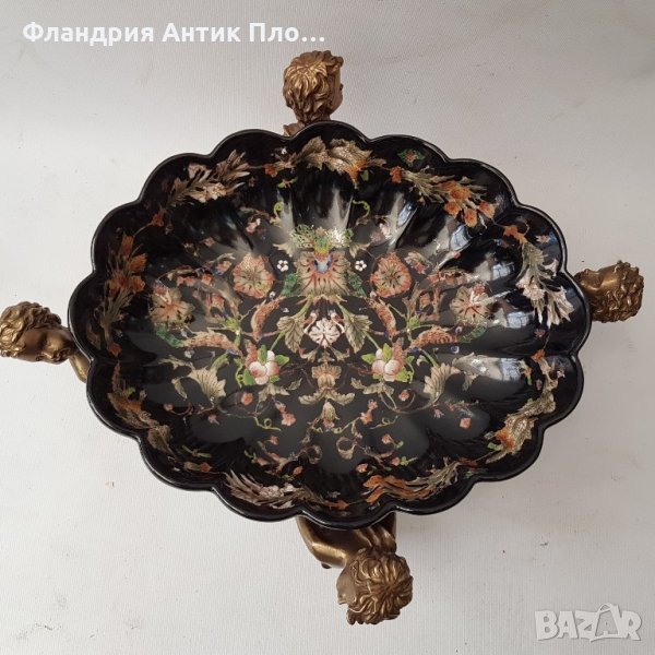 Изящна изработка от състарен порцелан, изрисуван в черно с цветни флорални мотиви и фигури изпълнени от плътен бронз.