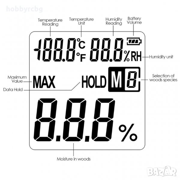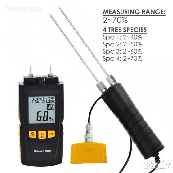 се използва за измерване на влагата в дърво, бамбук, хартия, домакински