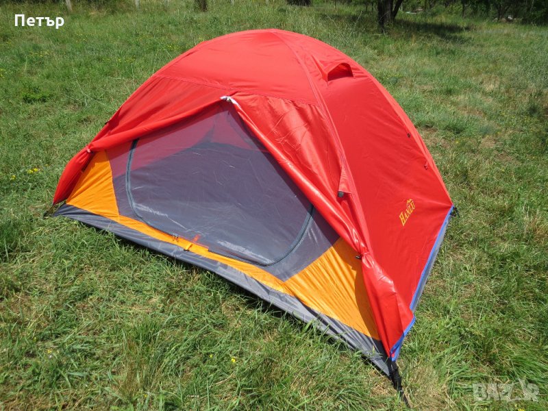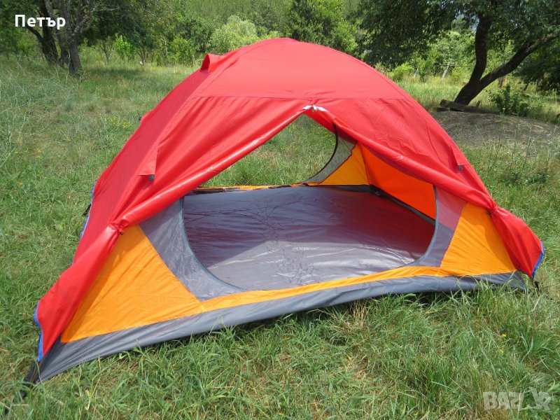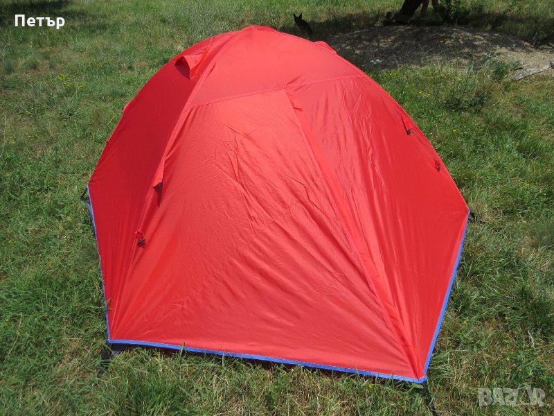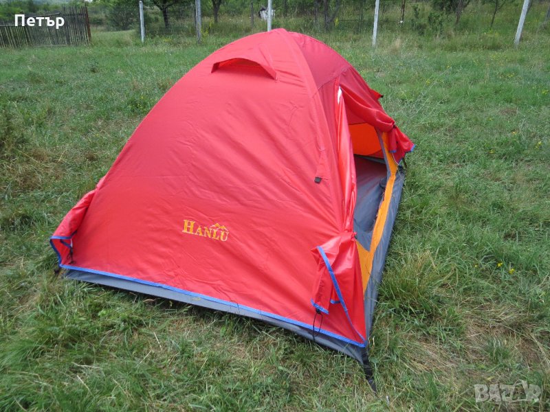 Продавам чисто нова двуместна двуслойна палатка с два входа и две входни пространства модел HL5524. Ширина 150 см, дължина 210 см, височина 110 см. Има две триъгълни входни пространства от по 60 см. Платът е рипстоп (армиран) с нишка за здравина. Рейките са алуминиеви 7.9 мм - висок клас. Тегло 2 кг. Водоустойчивост на покривалото и дъното 3000 мм. Цветът е само син.