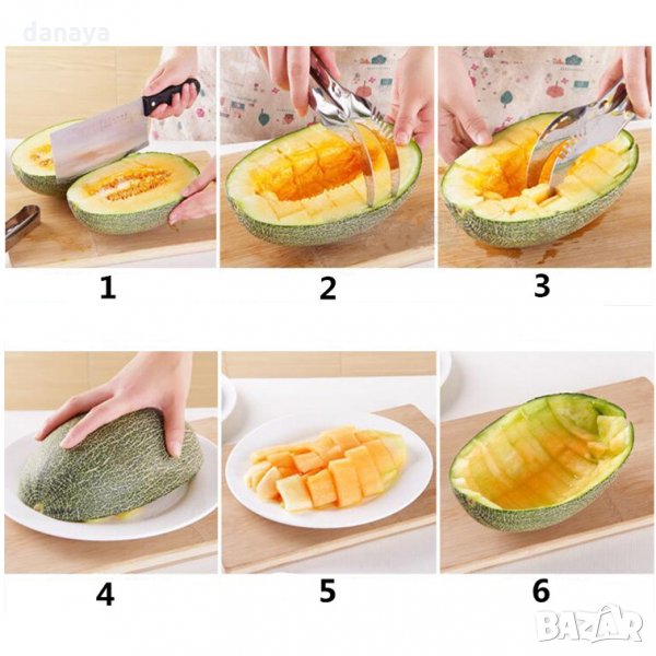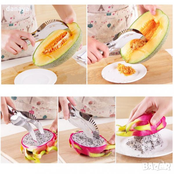 С уникалния си дизайн съчетавате 2 в 1 функцията щипка и нож за лесно рязане на идеални парчета и лесно сервиране, без да цапате. С този мултифункционален нож с лекота се изчистват семките на пъпеша, а след това разрязването е като детска игра. Изработен от неръждаема стомана, удобна дръжка, лесен за почистване.