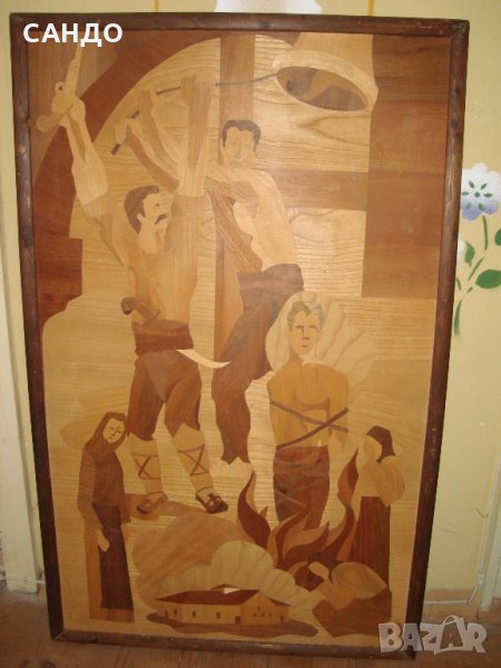 Картина интарзия - Априлско въстание -фигурална композиция . Ръчна изработка от различни парчета дървесен фурнир. Автентична и много добре запазена. Изработката е мое дело, единствено копие. Размери 93 см х 58 см.