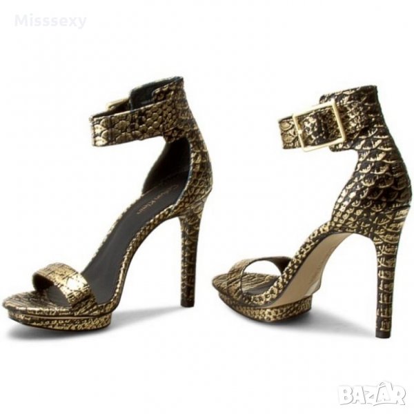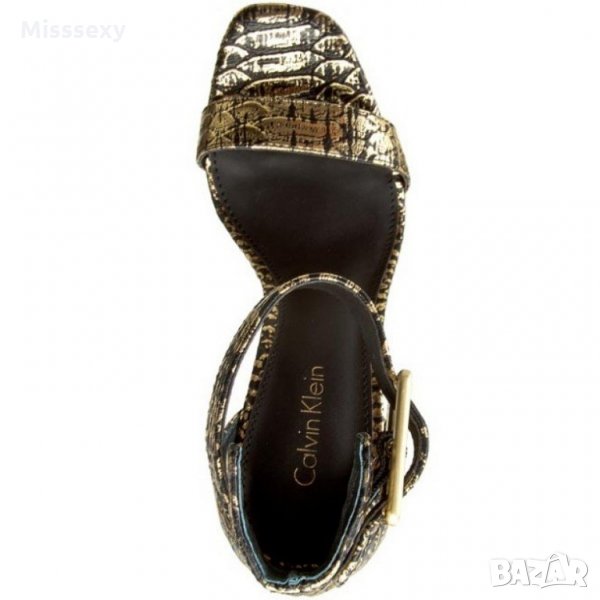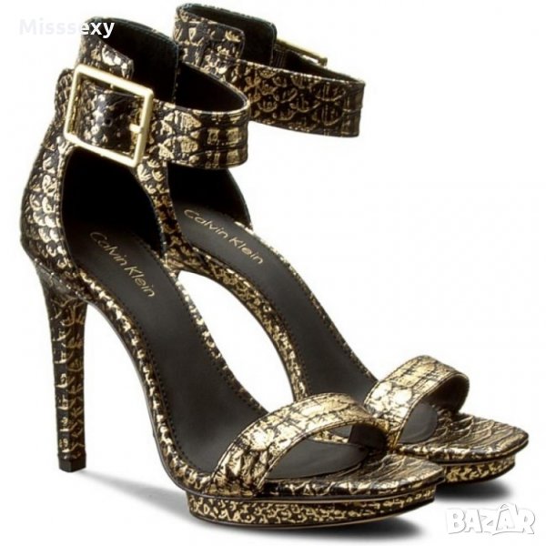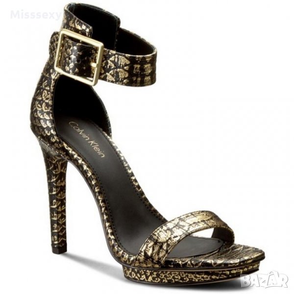 ПРОМО 🍊 CALVIN KLEIN 🍊 Оригинални кожени сандали в златисто черно с висок ток № 39 нови с кутия