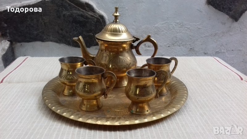 Ръчно кован бронзов индийски сервиз- 6 части. Диаметър на подноса- 21 см- Височина на чашка - 5 см. Височина на чайника- 12 см.