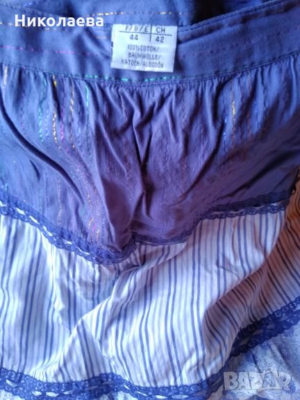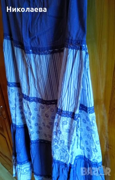 Дълга разкроена пола(100% памук),с различни по цвят и десен волани, в бяло и синьо,с възможност за набиране чрез сатенени връвчици между всеки волан.Не прозира, много лека.Дължина 100 см.Обиколки: талия 82 см(закопчава се със скрит цип отстрани),ханш 128 см,в долния край 154 см.Без забележки.
