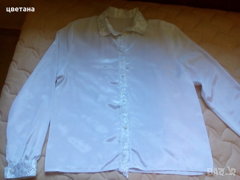 Бяла копринена блуза с дантелена яка и седефени копчета, гръдна обиколка 98см, дължина 60см, дължина на ръкава 60см, цена 10лв.