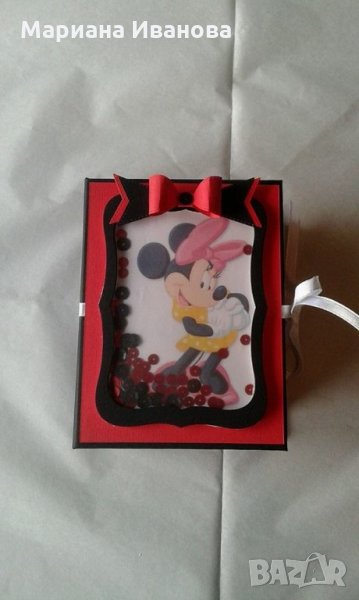 Интерактивни ръчно изработени албуми за 38 бр. снимки с р-р 13/9 см, 2 тага. Върху корицата на "Мини Маус" е изработена шейкър картичка / мънистата се движат при разклащане на албума/.Цена на това албумче - 33 лв.