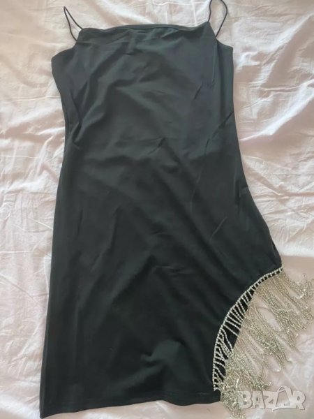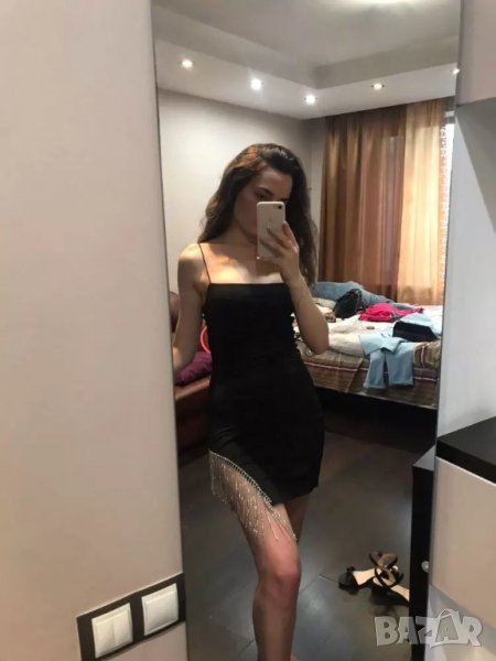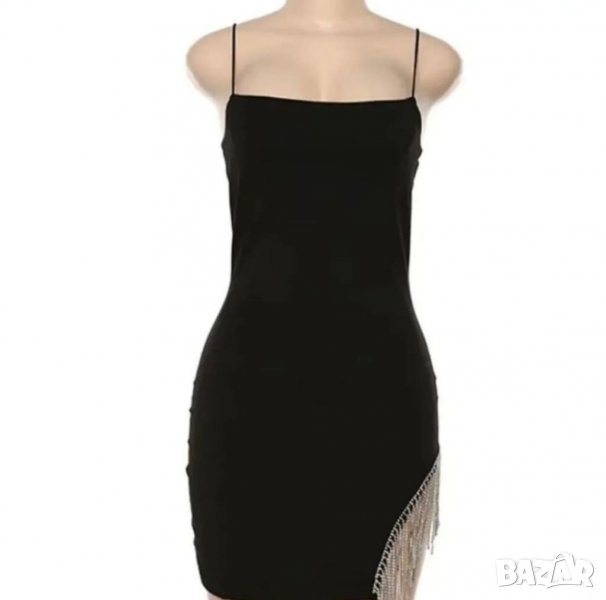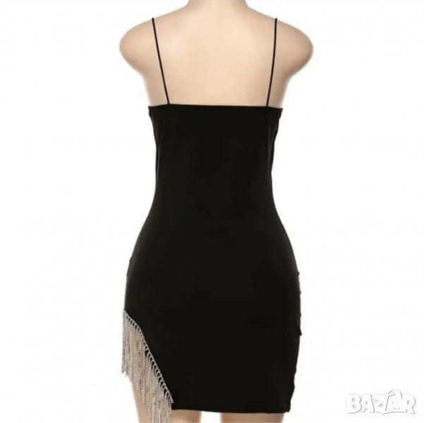 Уникална черна рокля с кръстосани презрамки и ресни от камъни