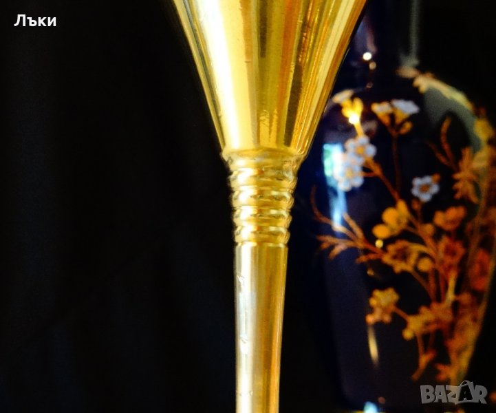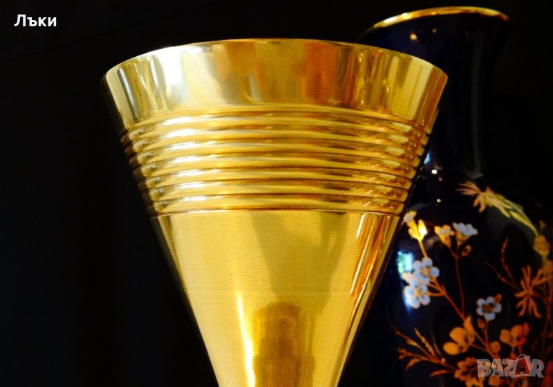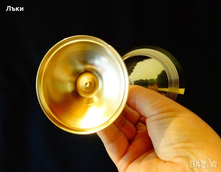 Швейцарски висок бокал,чаша за вино,мартини,шери,вермут, майсторска ръчна изработка от високо качествен масивен бронз,който блести като златен и звъни като камбана.Има стилна релефна декорация.Височина 21 см.,диаметър 9.5 см.,тегло 260 гр.Вместимост 200 мл.