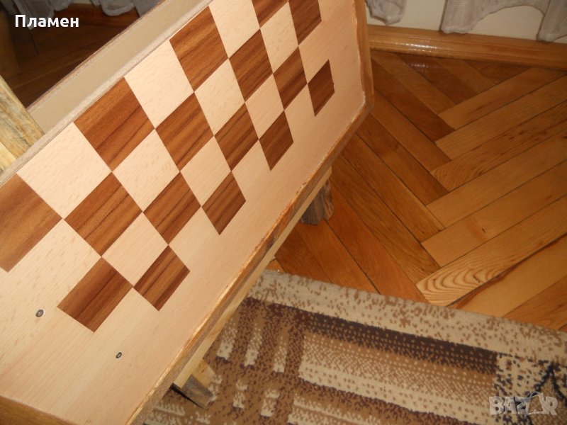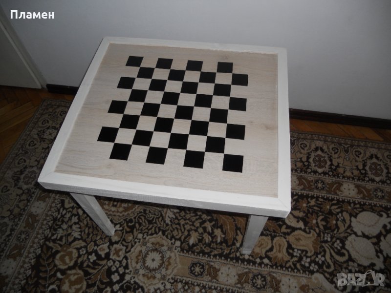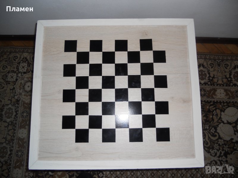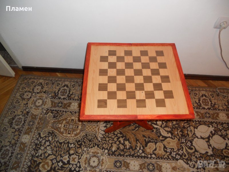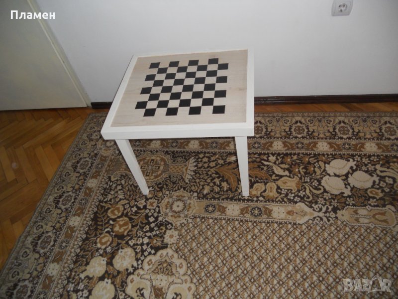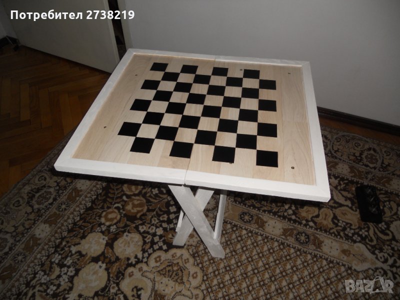 Масата е висока е 70 см .Плота е за голям шах .По желание правя и по размер на клиента цената е според вида и размера на масата.Тази на първата снимка и бялата са по 75 лева.Обявената цена е за сгъваемите.На последните снимки са плотове с размери по големи по избор на клиента.