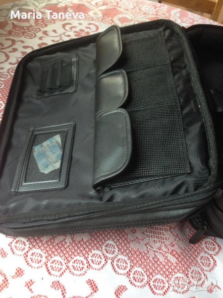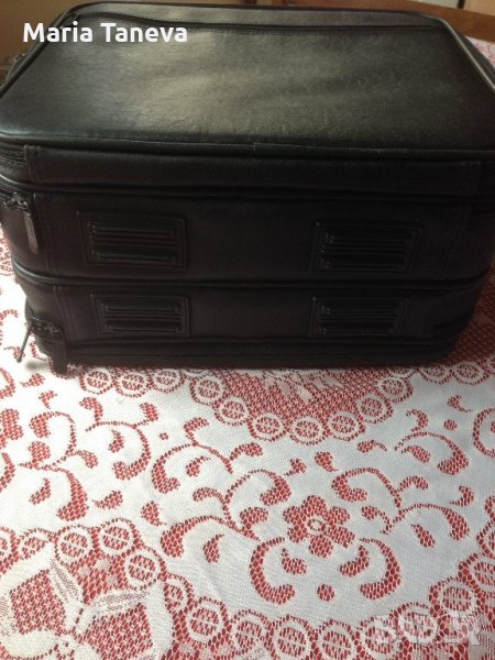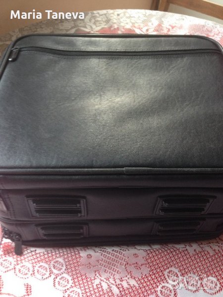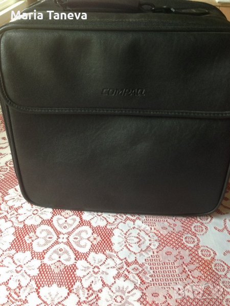 Чанта от черна естествена кожа, марка "Компак" за преносим компютър /лаптоп/. Чантата е с дължина 35 см, ширина 31 сл и дебелина 18 см. Чантата има няколко разпределения вътре за аксесоари на компютъра Има външен джоб и къса и дълга дръжка,която е подвижна.