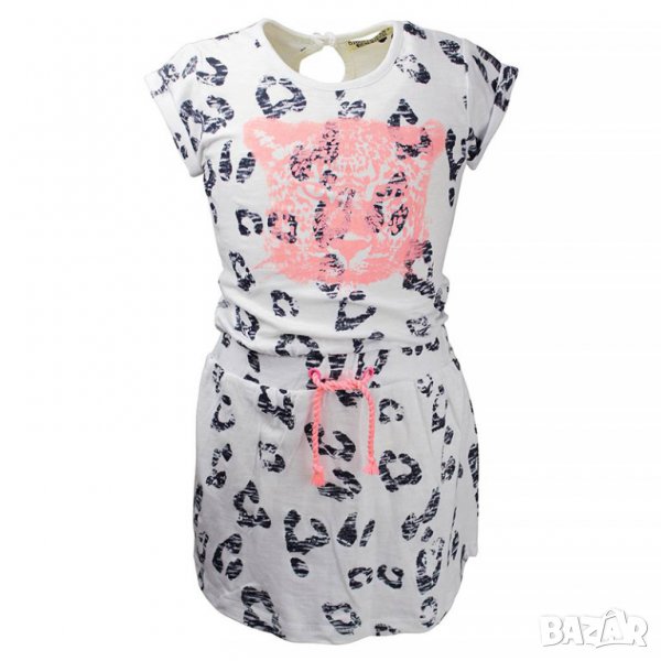 Красива и модерна детска рокля с клин в неоново прасковен цвят. Моделът на роклята е с ластик в талията и декоративни връзки; клинът е 7/8, с набор отстрани.