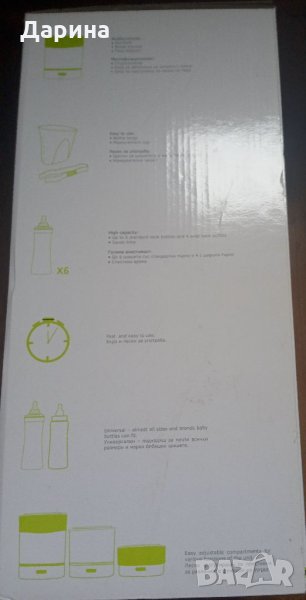 Продуктът е не само с функцията за стерилизация на бебешки шишета и аксесоари , но и за затопляне на мляко и варене на пара на плодове , зеленчуци и яйца ( вместимост 6 яйца ) .