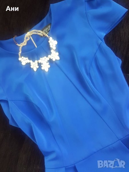Уникална рокля в наситен син цвят.Материята е плътна и пада тежко.Отзад е малко по-дълга.Не е носена,без забележки.Без етикет. Размер 38,С.