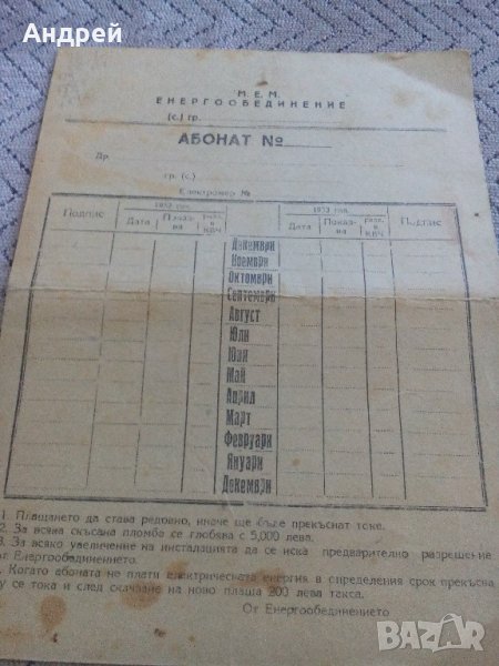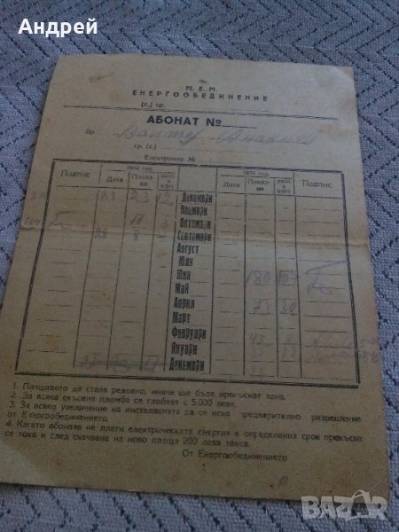 Стар абонатен картон за ел.енергия от соца!
