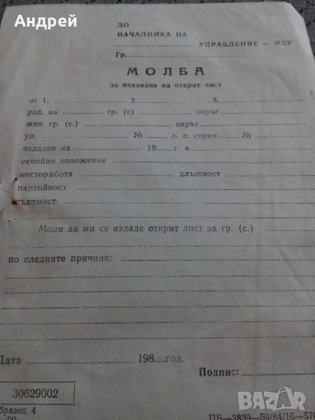Бланка,Молба за издаване на открит лист, снимка 1 - Антикварни и старинни предмети - 22056647 Бланка,Молба за издаване на открит лист, снимка 2 - Антикварни и старинни предмети - 22056647 Бланка,Молба за издаване на открит лист, снимка 3 - Антикварни и старинни предмети - 22056647 1/3