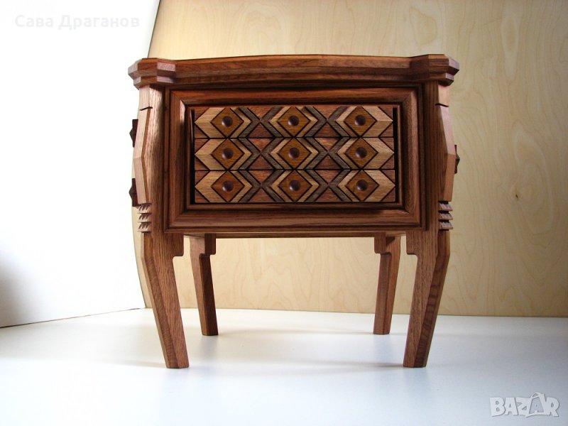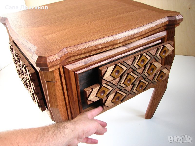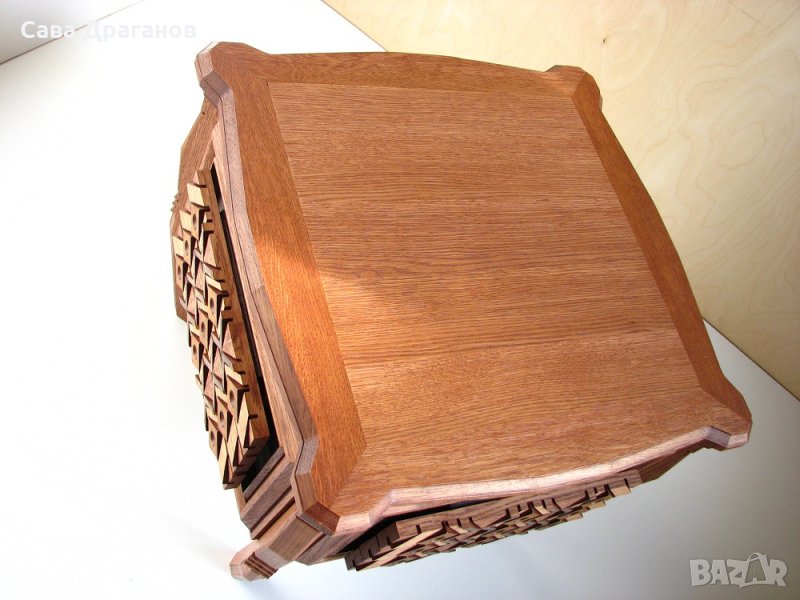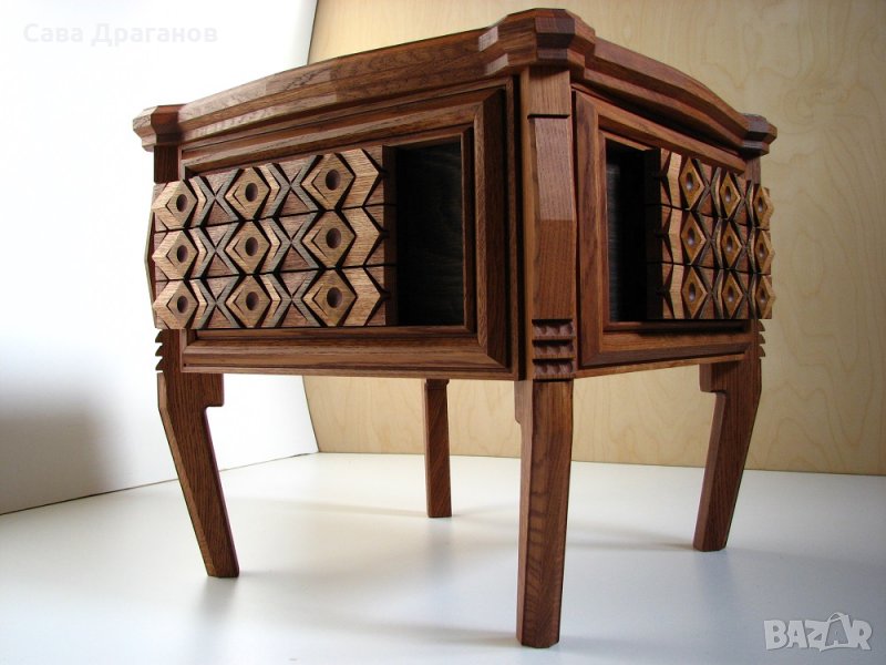 Кинетичните пана разположени от четирите страни на масата със съвременна дърворезба дават възможност за частична промяна на визията чрез преместване на ляво или на дясно в зависимост от виждането на притежателят за крайната визия.
