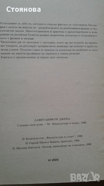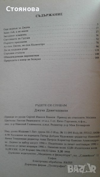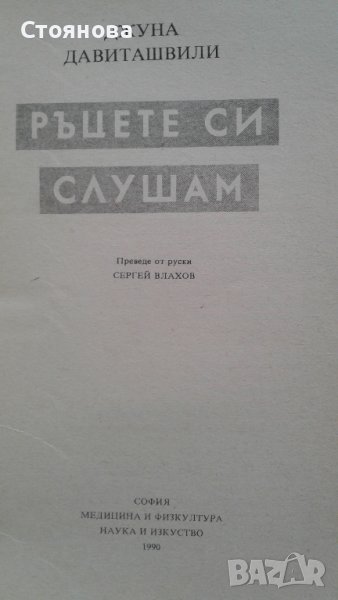 1)Джуна Давиташвили "Ръцете си слушам" ДИ "Медицина и физкултура, Наука и изкуство" 1990 г., меки корици - цена 9 лева;