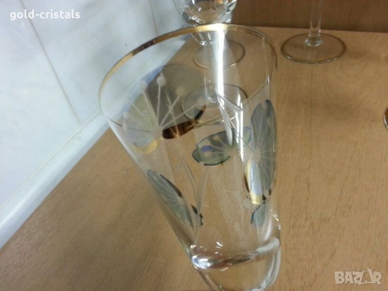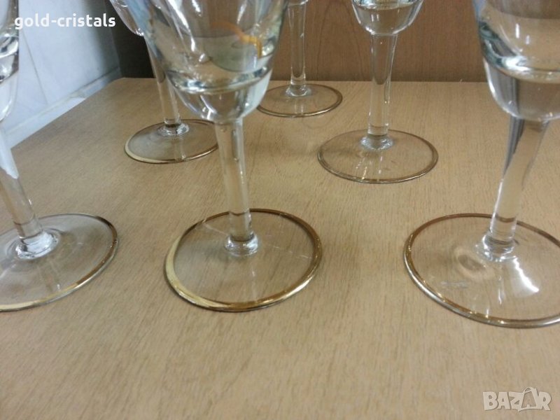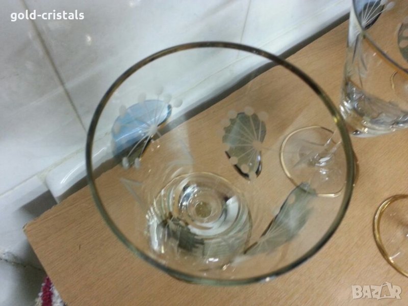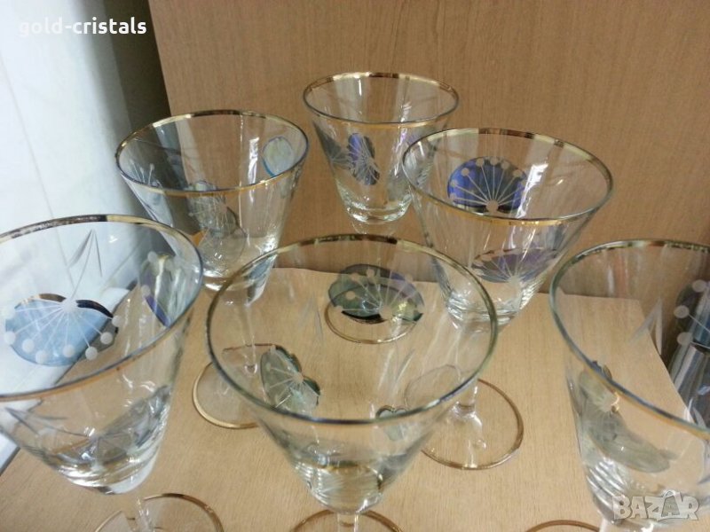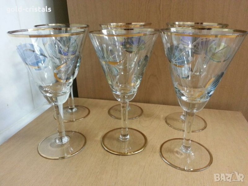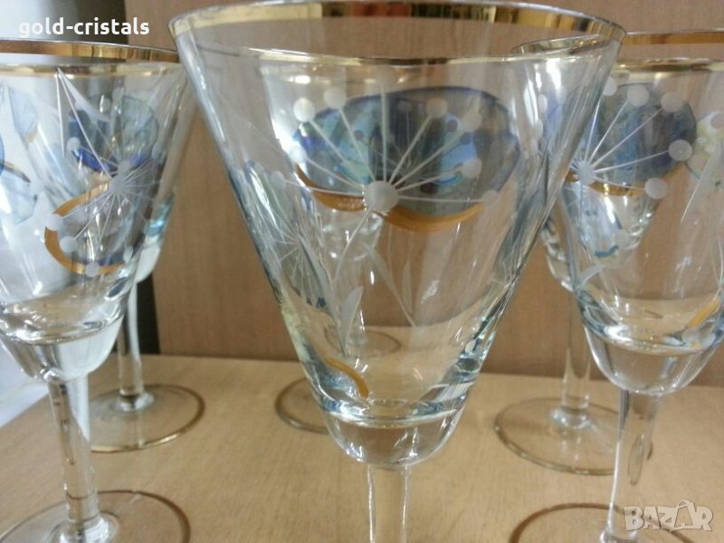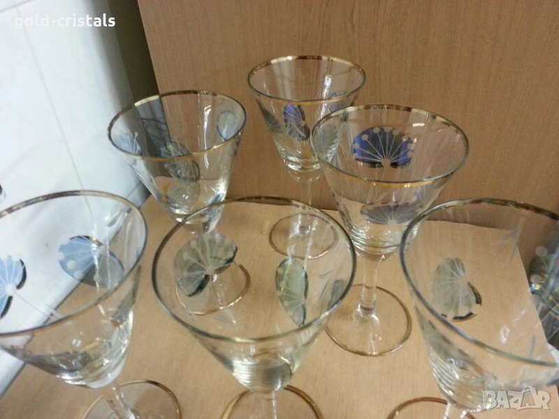 Ретро стъклени чаши за вино с златен кант и гравюра позлата цветно стъкло кристално стъкло ретро стар антикварен арт декор винтидж колекция стари старинни антикварни предмети обзавеждане за дома и семейството подходящи за подарък за ценители и колекционери сервиз комплект сет лот чаши чашки за маса празници гости трапезария подарък празник дома поводи тържество посуда кухня готвене сервиране хранене