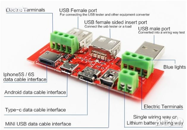 Тази платка може да се използва за проверка на различни електронни уреди с налични USB портове, техните интерфейсни проводници както и проверка на литиеви акумулатори. С наличните 7 различни типове USB-куплунги поддържа Apple iPhone 5s, 6s, Type-c, Micro USB, Mini USB както и клемни и прочие линейни интерфейси за предаване на данни.