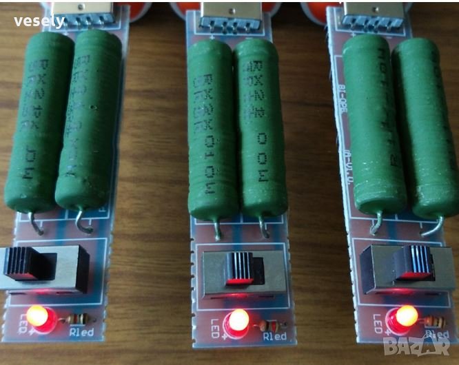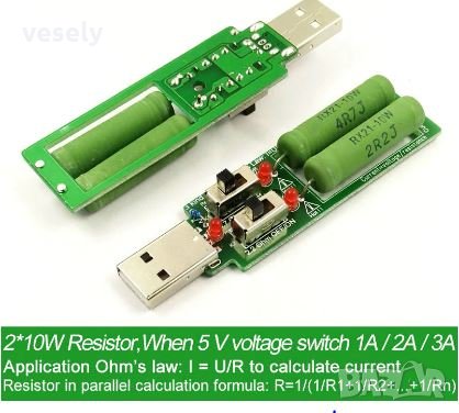 USB резисторен електронен товар с 2 превключватели регулиращ три стойности на ток до 3A при подходящо свързване според закона на Ом.